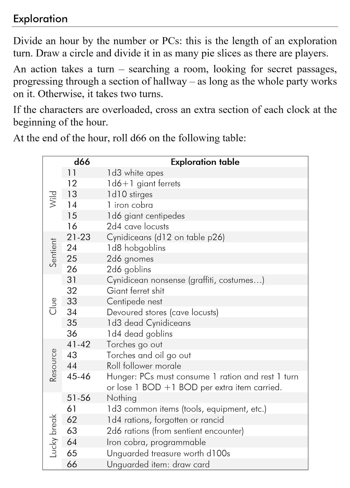 The demihumans have two conditional skills: the dwarf gets Wisdom d6 and Intelligence d6 when underground; the haubitz has Constitution d6 to resist fatigue and Dexterity d6 to hide; and for the elf I'll go with Charisma d6 to impress and Intelligence d6 for ancient lore. I know what you're thinking: he's introducing complexity just two minutes after pledging to KISS. Hey, it's a work in progress.