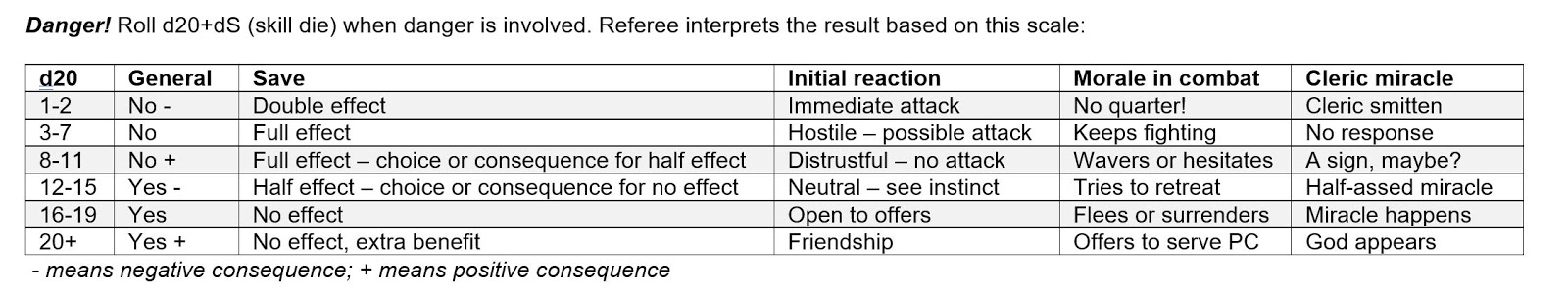 EDIT: Following some useful comments by Brian and Bruno on G+, I thought I should add that the d20 save comes with a range of results that let me describe various degrees of success and failure, offer choices, take away resources, etc. Here is the table I use: